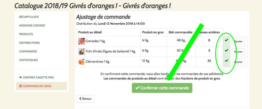 Important : que vous ayez des quantités à ajuster ou pas, il vous faut toujours cliquer la bannière violette « Ajuster la commande en gros », puis cliquer la bannière « Confirmer cette commande ». Sinon la commande de votre groupe ne sera pas prise en compte !