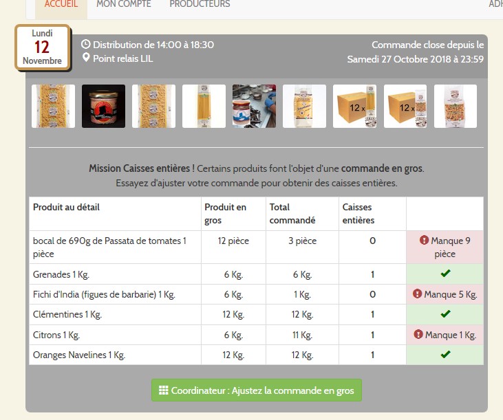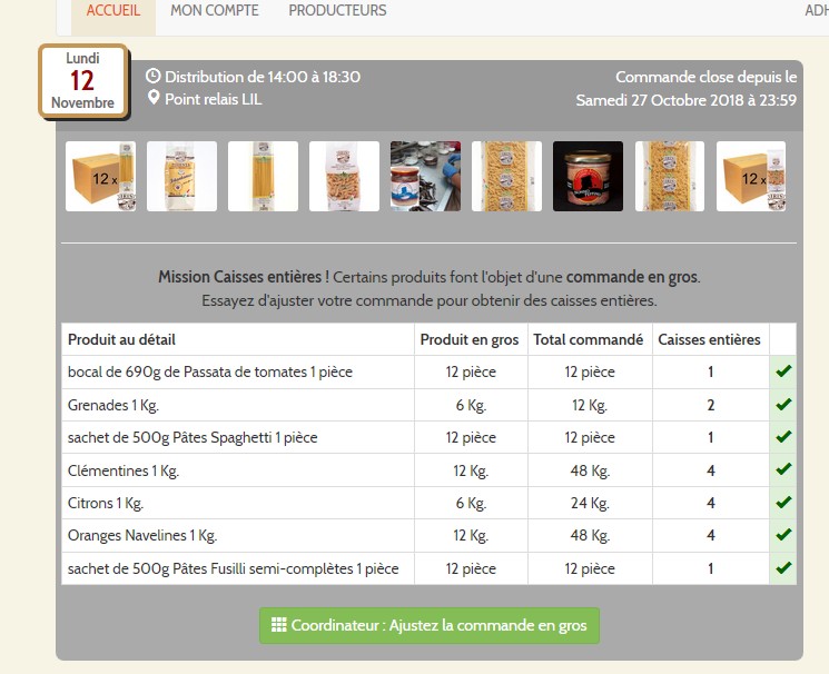 1. Quand les commandes individuelles sont closes, vous voyez en tant que coordinateur un tableau comme l’un des deux ci-dessous. Cliquez sur la bannière verte « Ajuster la commande en gros », même si vous n’avez rien à ajuster.