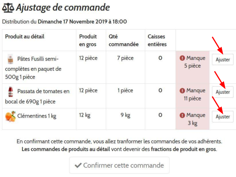 5. Si vous avez des quantités à ajuster, le tableau fait apparaître les quantités à ajuster. Cliquez sur « Ajuster » à droite du produit (vous pouvez visionner la vidéo en haut de cette page si les explications ci-dessous ne vous suffisent pas).