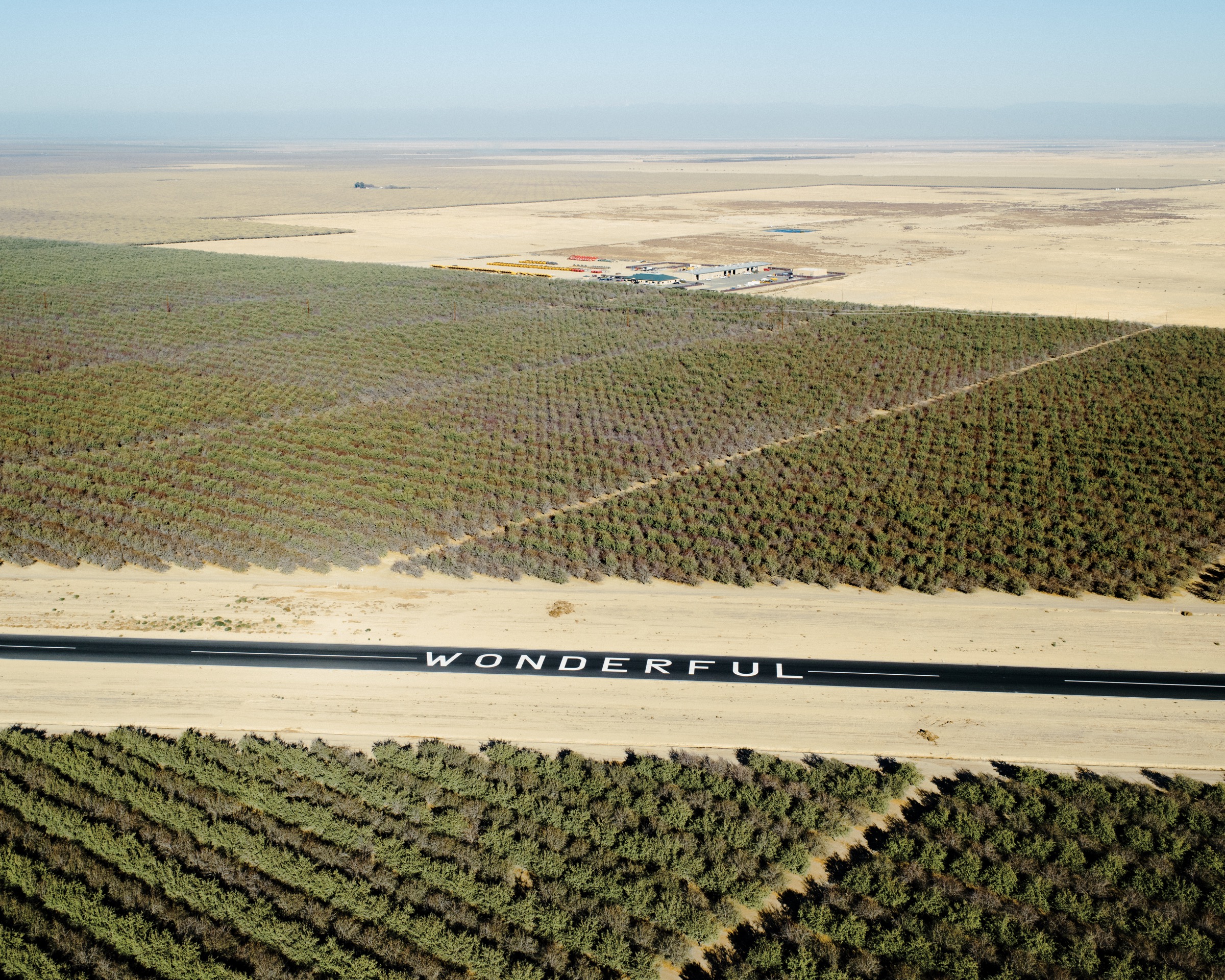 - D’abord A kingdom from dust, long article de Mark Arax du California Sunday News. Article en anglais, mais même si vous ne le lisez pas, parcourez-en les photos qui, à elles seules, valent le détour, telle celle ci-dessus. Cet article narre la saga d’une compagnie californienne qui porte le nom de Wonderful Company (sic) et possède plus de 70 000 ha plantés de 15 millions d’amandiers, de pistachiers, de grenades et de mandarines.