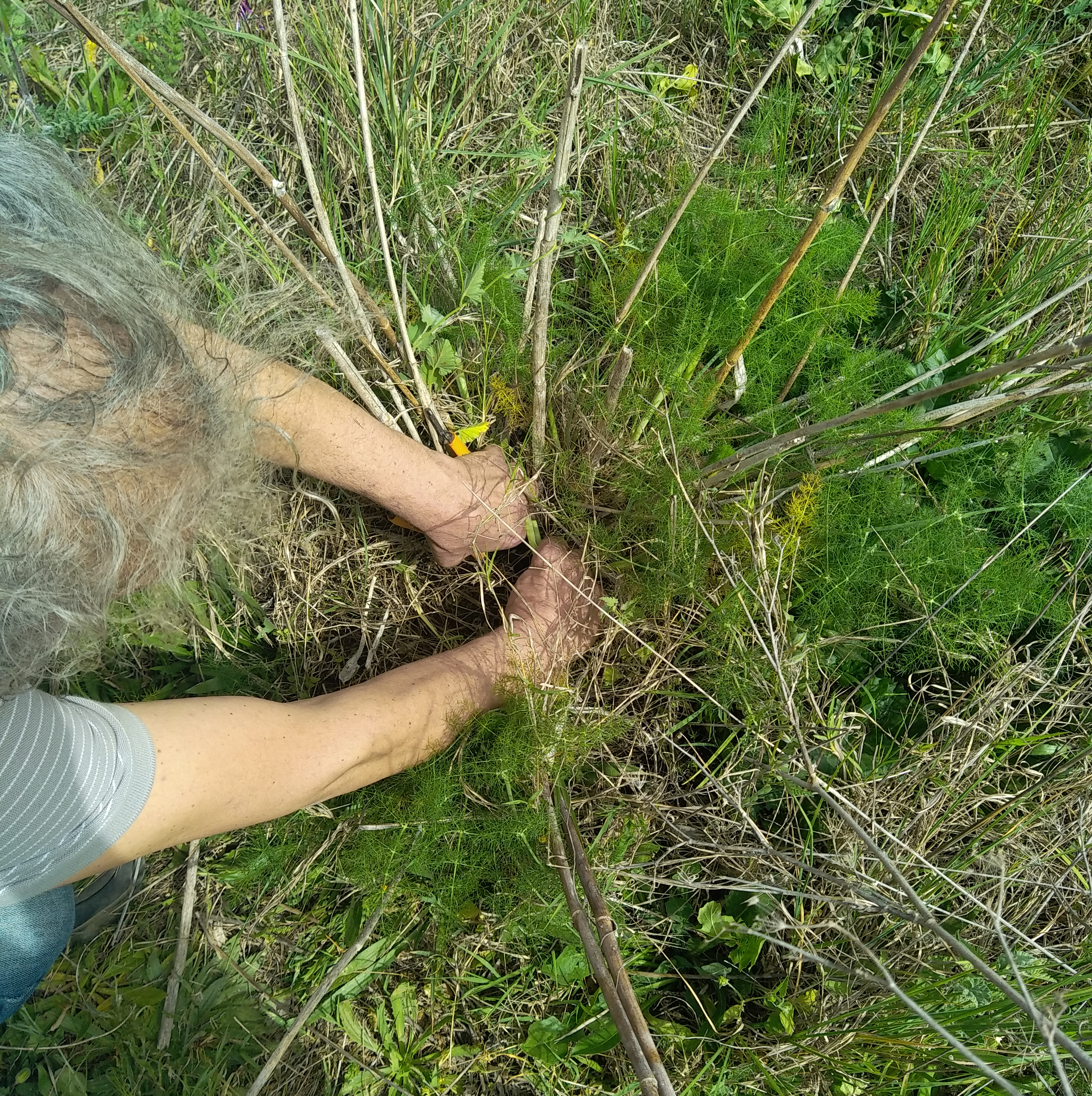 Pesto di Finocchietto Mi-avril 2024, cueillette de fenouil sauvage au domaine Fegotto di Canicarau, situé au centre sud de la Sicile près de Piazza Armerina. On y voit, sécateur en main et œil averti, Gabriele – dit Gab, qui est aussi comptable pour le consorzio Le Galline Felici. Ne vous fiez pas à l’apparence très verte du paysage : ici, comme ailleurs en Sicile ne sont tombées que quelques gouttes de pluie depuis janvier… et une petite partie du domaine avait déjà subi un incendie début avril. ↪ Cliquer sur les images pour les agrandir.