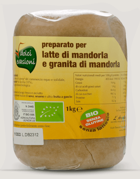 Cette préparation pour lait d’amande ne contient aucun additif, seulement des amandes pelées bio de Sicile (35%) et du sucre de canne équo-solidaire. Outre lait d’amande et granité, cette préparation permet de réaliser tartes, glaces et crèmes à l’amande.
