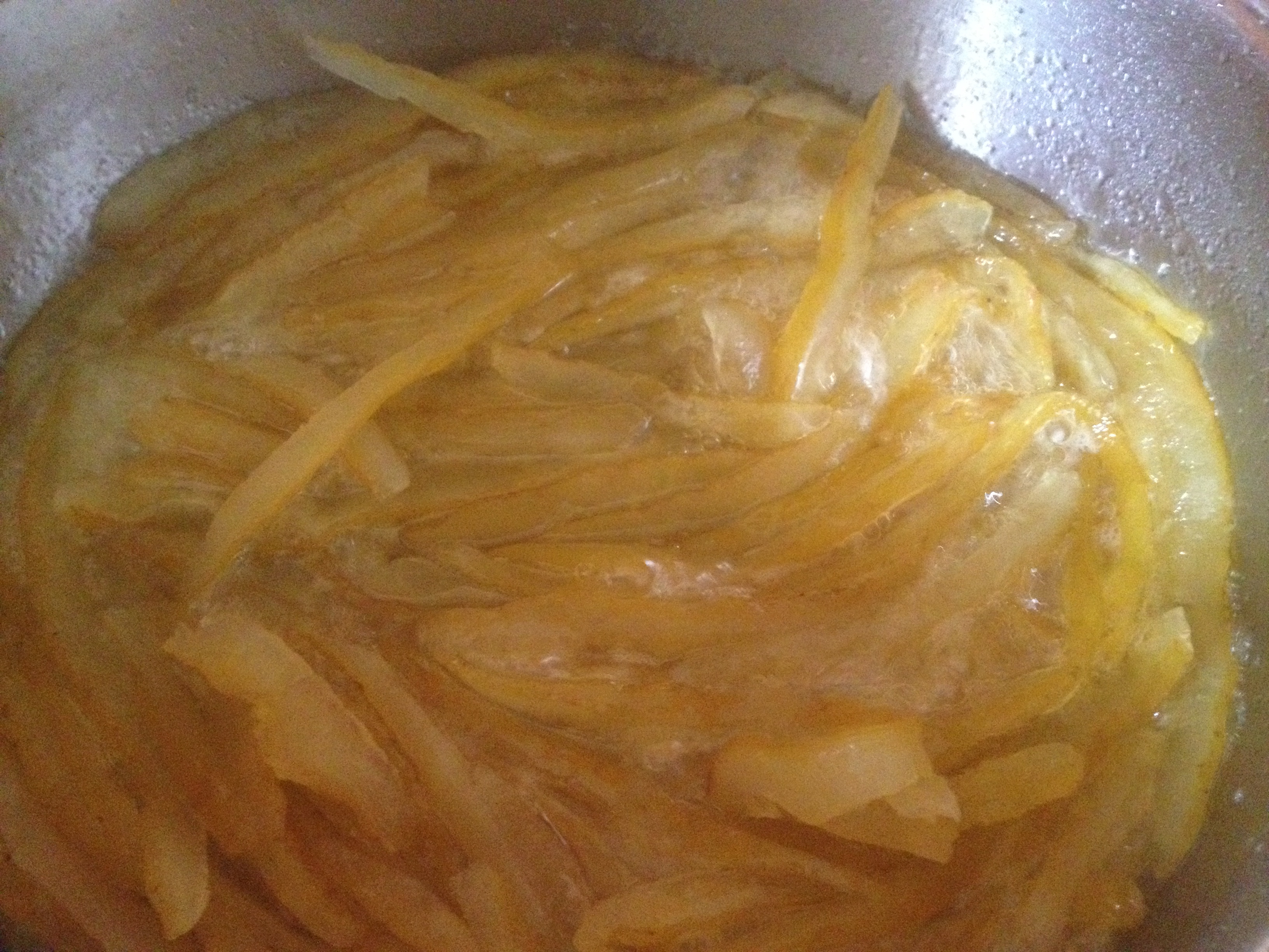 Répéter pour la dernière fois l‘ébullition pour 10 minutes. A ce moment égouttez les tranchettes de cédrats et mettez les à sécher sur une planche à découper en polyéthylène.
