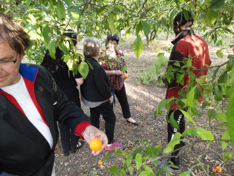 Visite passionnante – en compagnie de notre indispensable et bienveillant Beppe – dans le « paradis » de Fiorella Bonfanti , productrice de citrons et de bien d’autres délices. Premiers arancini à Modica, puis visite de Ragusa Ibla… Plusieurs participants.e.s, ému.e.s de tant de bonté et de beauté, en ont décidé illico de rester sur place : les uns d’un coup de tête ont abandonné leur voiture de location chez Fiorella et un autre a décidé de suivre sans retour une jeune femme très belle sur les marches d’une église baroque de Modica… Vent puissant, ici dans le sud. Pas de nouvelles du groupe du nord. Nous espérons le retrouver demain soir contaminé d’autant d’émotions !